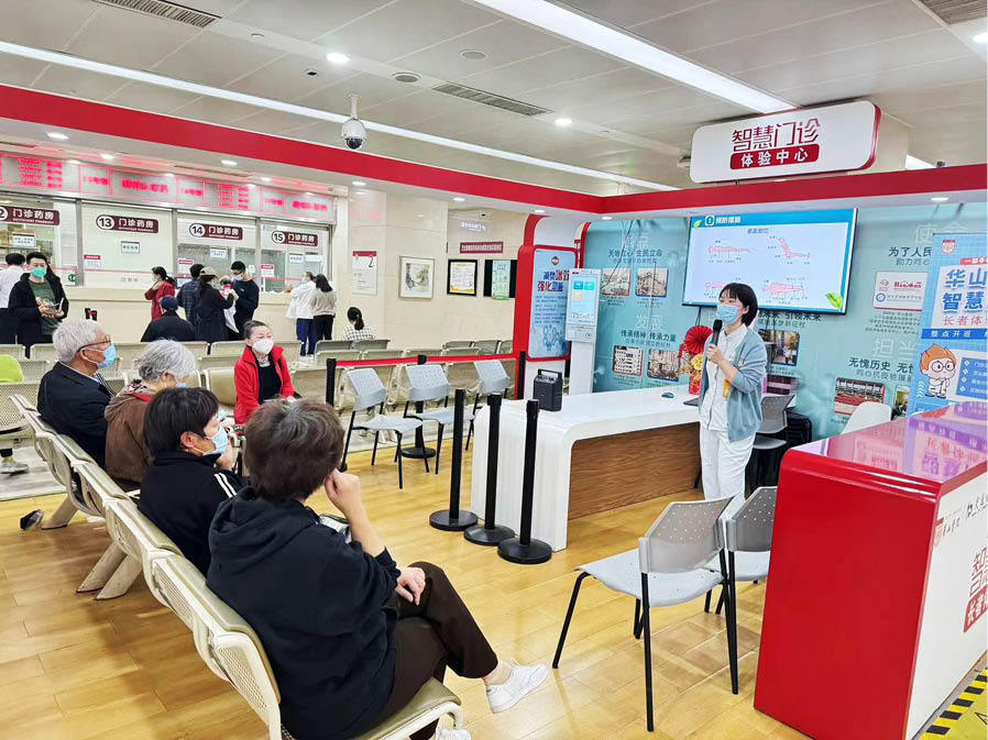 在推進新技術(shù)應用的同時,華山醫(yī)院充分考慮到目前還不能熟練使用智能設備的老年患者。在華山醫(yī)院門診二樓,每天都有公益性的課程,志愿者手把手教患者熟悉醫(yī)院看病流程,幫助老年患者方便就醫(yī)。
